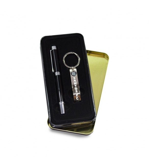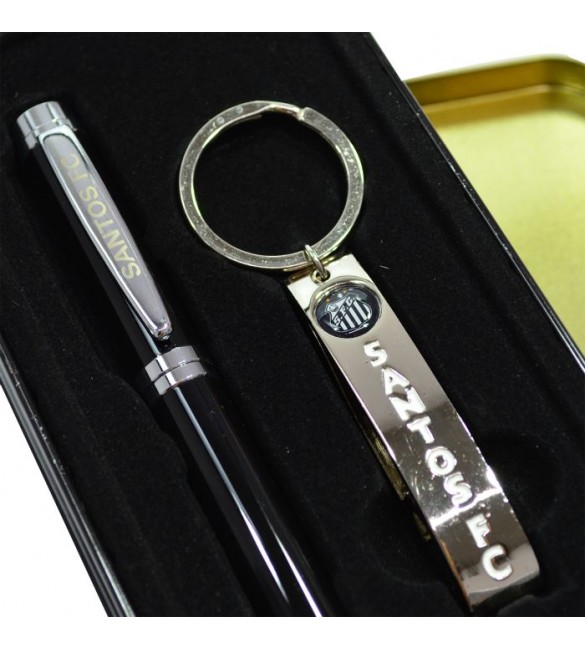 Olha que incrível! Jogo que vem com uma estilosa caneta de metal com tampa e um chaveiro que é abridor de garrafas. Os dois itens vêm customizados com brasão e marca do Santos, e dentro de uma lata também toda customizada nas cores do seu time de coração, prontos para servir de presente. Material: metal