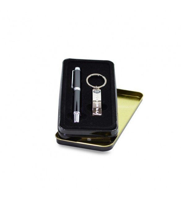 estojo de metal contendo uma caneta metal e um chaveiro de metal |