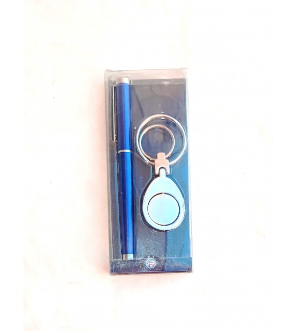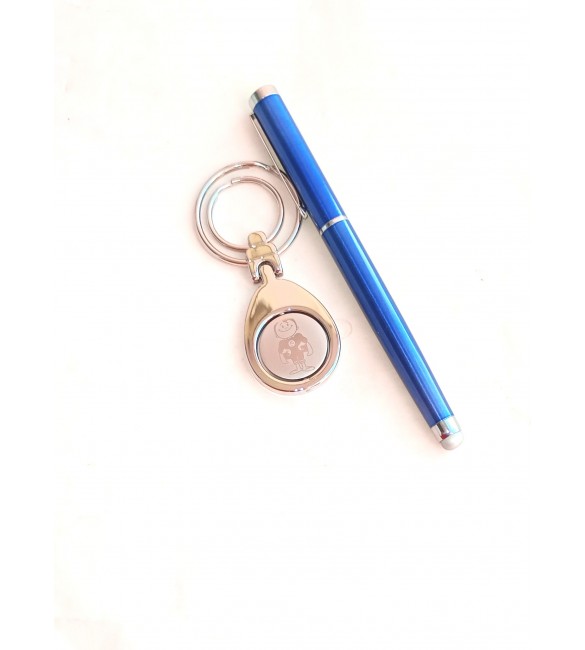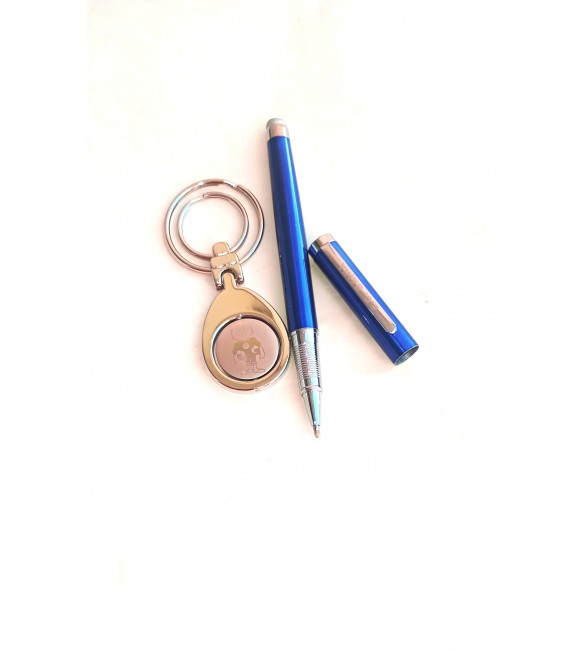 contendo uma caneta metal e um chaveiro de metal |
