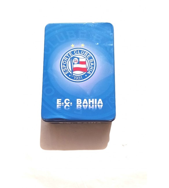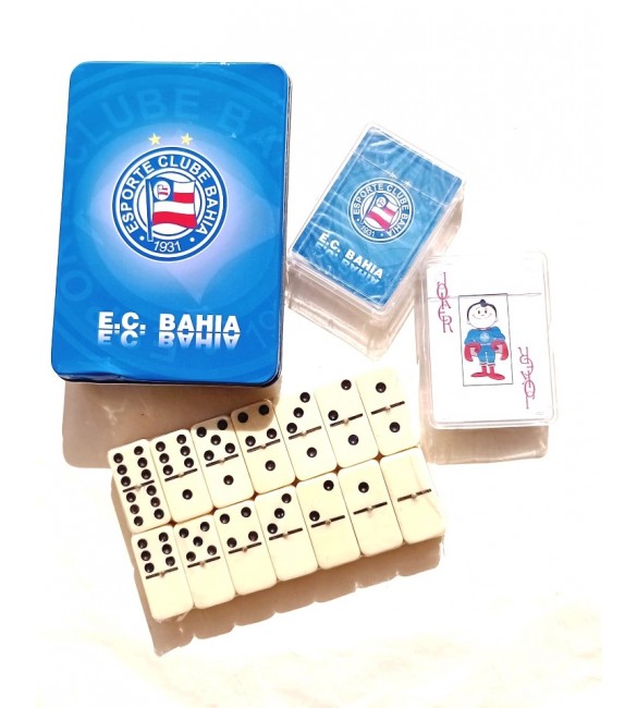 Jogo de dominó, acompanha dois baralhos, tudo dentro de uma estilosa lata. Os baralhos são customizados do Bahia, o dominó é unicolor sem estampa. Perfeito para dar de presente num aniversário, ou presenteie a si mesmo. Jogue dominó e cartas até altas horas com os amigos (as), brinque com seus filhos (as). Material lata: metal; Material dominó: osso; Material carta: papel e estojo plástico