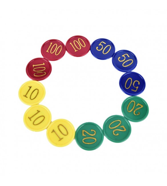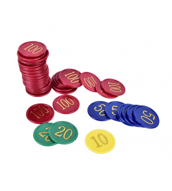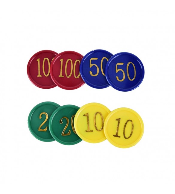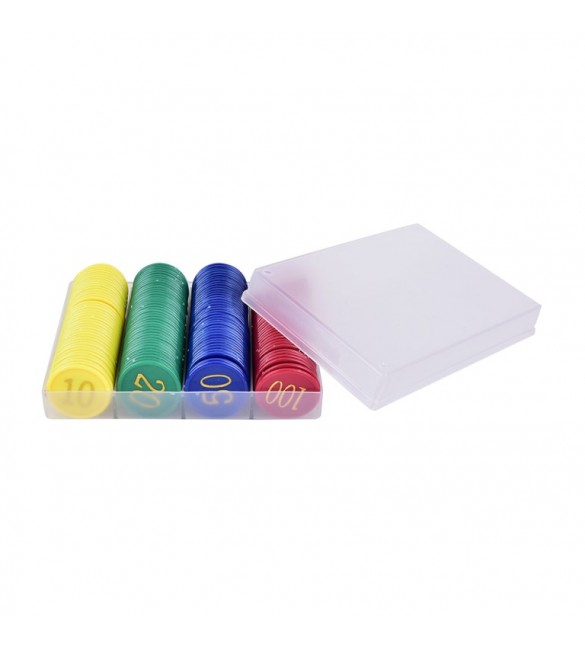 Caixa contendo 160 fichas numeradas e coloridas  para jogos sendo de 4 cores.