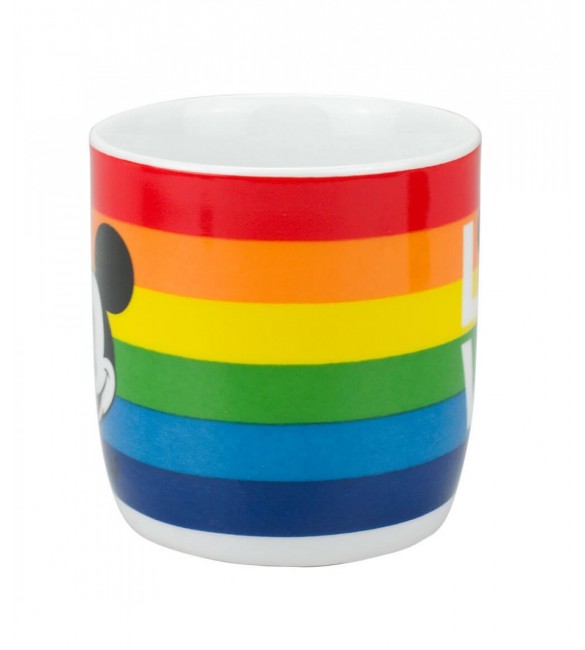 Caneca de porcelana com capacidade para 300 ml estampada com as cores do arco-íris e rosto do Mickey e ainda escrito Love. Coleção orgulho LGBT+. Material: porcelana.