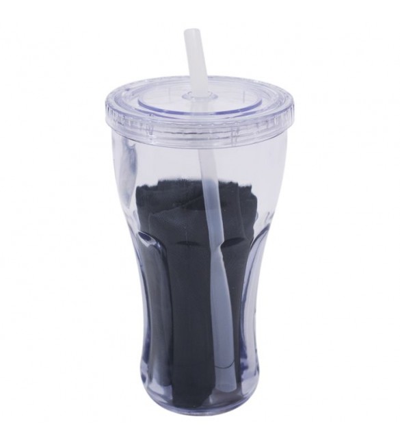 Copo de plástico 550 ml com tampa rosqueável e canudo de silicone. Vem com uma mochila tipo saco de 34 x 41 cm. Ambos produtos estampados com brasão do Vasco