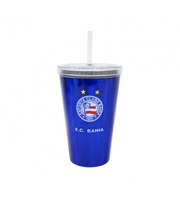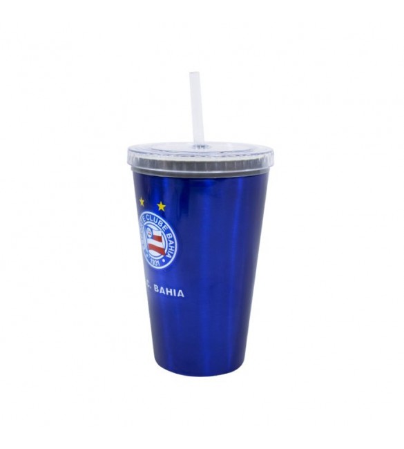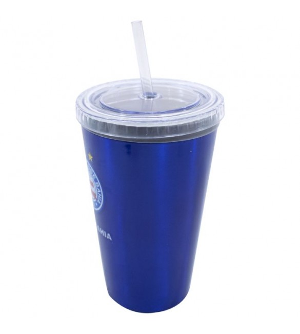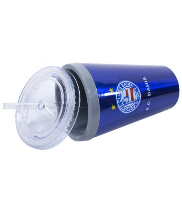 Copo de plástico que leva canudo. Cor nas cores do Bahia com estampa do brasão do time. Camada mais grossa das paredes do copo permite tomar bebidas muito mais gelada sem machucar a mão. Material: plástico; Litragem: 500 ml